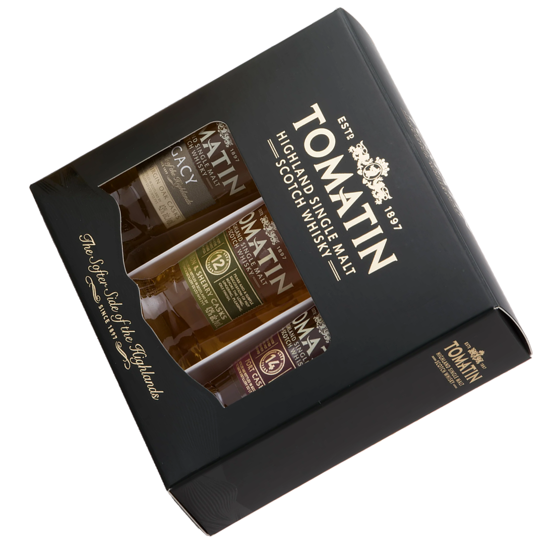 Tomatin Triple Pack включает в себя "Legacy" с легким и нежным вкусом, украшенным нотами цитрусов и бисквита, 12-летний виски с гладким и шелковистым вкусом, богатым фруктами и карамелью, и 14-летний виски с насыщенным маслянистым вкусом и богатым фруктовым букетом, каждый из которых производится с уникальной выдержкой и подходом, отражающим наследие и мастерство винокурни Tomatin.