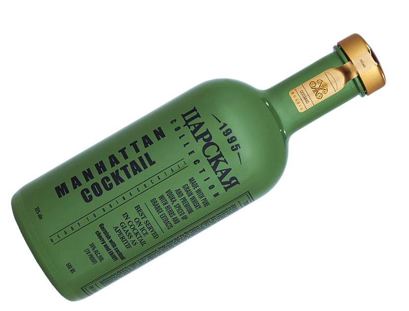 "Царская" Collection Manhattan — оригинальный напиток, созданный на основе зернового виски 5-летней выдержки, водки "Царская" Золотая с добавлением травяного и апельсинового настоя. Коктейль обладает гармоничным вкусом и ароматом с характерными цитрусово-травяными оттенками, он отлично сочетается с легкими закусками, орехами, сухофруктами и является отличной составляющей коктейлей.