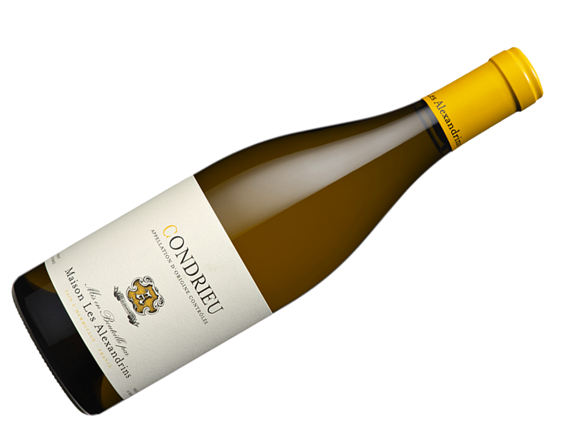 Condrieu от Maison Les Alexandrins — бледно-золотистое вино с богатым фруктово-кислотным вкусом, сложным ароматом экзотических фруктов и древесных оттенков, идеально сочетающееся с креветочным планшетом, отражающее уникальность винограда Viognier из AOC Condrieu благодаря мастерству трех виноделов долины Роны.