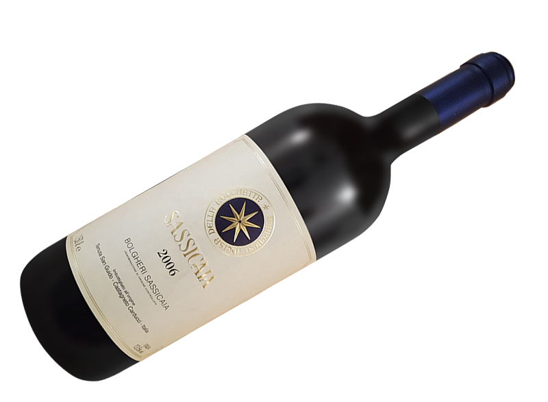 Sassicaia, Tenuta San Guido, Bolgheri DOC 2006 — элегантное и насыщенное красное вино из Тосканы с богатым ароматом черных ягод, розмарина и специй, выдержанное 24 месяца в французском дубе, идеально подходящее для сопровождения блюд из дичи и выдержанных сыров.