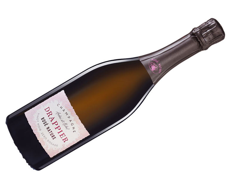 Champagne Drappier, Brut Nature Rosé Zero Dosage — розово-лососевое шампанское с сухим вкусом красных и цитрусовых фруктов, изысканными нюансами белого перца, ароматами клубники и малины, идеально как аперитив или в сочетании с морепродуктами, выращенное без добавления тиражного ликера на известковых почвах вокруг Урвилля, подчеркивая свежесть и минеральность Пино Нуар.